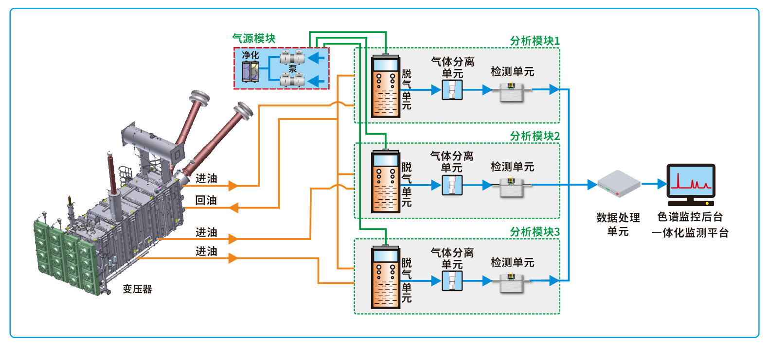 整套系統采用冗余模塊化設計,每套油樣采集與油氣分離檢測單元相互獨立工作,互不干擾,分別輸出乙炔檢測數據,一套檢測單元工作異常或退出時不影響其它模塊的運行。